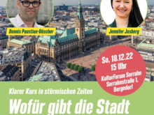 Klarer Kurs in stürmischen Zeiten – Wofür gibt die Stadt Hamburg ihr Geld aus? mit Jenny Jasberg und Dennis Paustian-Döscher (GRÜNE Bürgerschaftsfraktion) Sonntag, 18. Dezember, 15 Uhr SerrahnEINS (Serrahnstr. 1, Bergedorf)