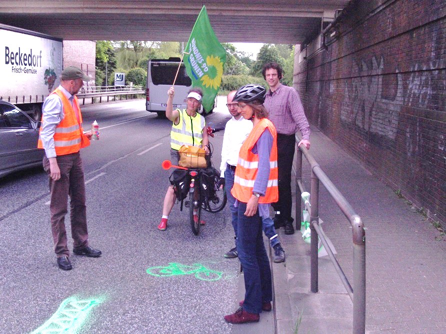 Im Rahmen der verkehrspolitischen Radtour mit Till Steffen und Norbert Fleige haben die Teilnehmer unter der Eisenbahnbrücke am Oberen Landweg symbolisch einen Fahrradstreifen mit grüner Sprühkreide eingerichtet.