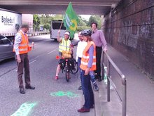 19.05.14 - Im Rahmen der verkehrspolitischen Radtour mit Till Steffen und Norbert Fleige haben die Teilnehmer unter der Eisenbahnbrücke am Oberen Landweg symbolisch einen Fahrradstreifen mit grüner Sprühkreide eingerichtet.