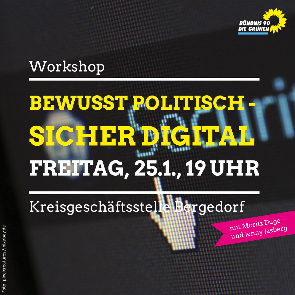 Workshop mit Moritz Duge und Jenny Jasberg Der Kreisverband Bergedorf veranstaltete aus aktuellem Anlass einen Workshop zur digitalen Sicherheit. Zusammen mit Moritz Duge (LAG Medien und Netzpolitik) und unserer Kreisvorsitzenden Jenny Jasberg (Mitarbeiterin im Ministerium für Energiewende, Landwirtschaft, Umwelt, Natur und Digitalisierung des Landes Schleswig-Holstein) beantworten wir Fragen zum sicheren Umgang mit den eigenen Daten. Hier können Fragen aller Art gestellt werden und Infos zu Maildiensten bis Social Media-Nutzung mitgenommen werden. Wann?   Freitag, 25.1., 19 Uhr Wo?       Kreisgeschäftsstelle Bergedorf, Sachsentor 12 Auf unserer Website findet ihr eine nach wie vor aktuelle Übersicht zu dem Themenblock mit Tipps aller Art zu digitaler Sicherheit.
