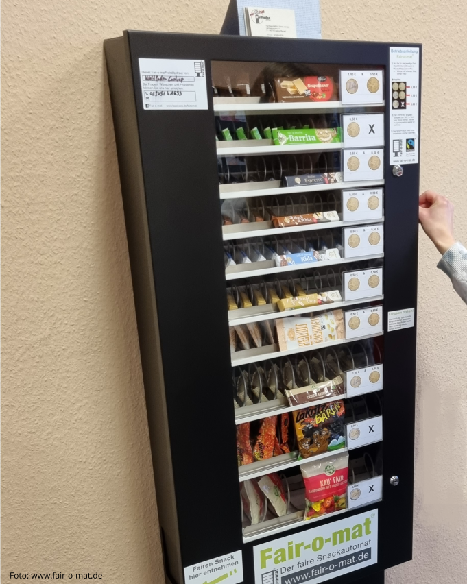 Auf grüne Initiative hin hat jetzt die Bergedorfer Koalition per Antrag in der Bezirksversammlung beschlossen, dass die Voraussetzungen für die Aufstellung eines sogenannten Fair-o-maten geschaffen werden. Dabei handelt es sich um einen mechanischen Automaten, über den Snacks und andere kleine Fair-Trade-Artikel verkauft werden.