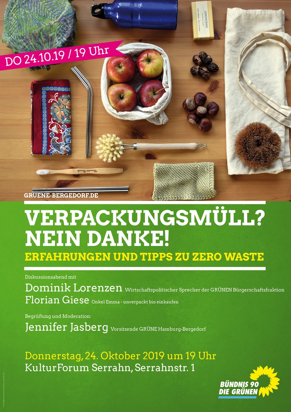Diskussionsabend mit  Dominik Lorenzen, Wirtschaftspolitischer Sprecher der GRÜNEN Bürgerschaftsfraktion und Gründer von "Stückgut" und Florian Giese, Onkel Emma - unverpackt bio einkaufen Begrüßung und Moderation: Jennifer Jasberg, Vorsitzende GRÜNE Hamburg-Bergedorf ZERO WASTE - Das klingt wie die neueste vielversprechende US-Diät. Und irgendwie stimmt das auch. KEIN MÜLL! Und mit ein bisschen Disziplin hat man plötzlich schlanke Küchenschränke und eine ganze Ecke weniger Ballast in seinem Leben. Kommt vorbei und diskutiert mit!